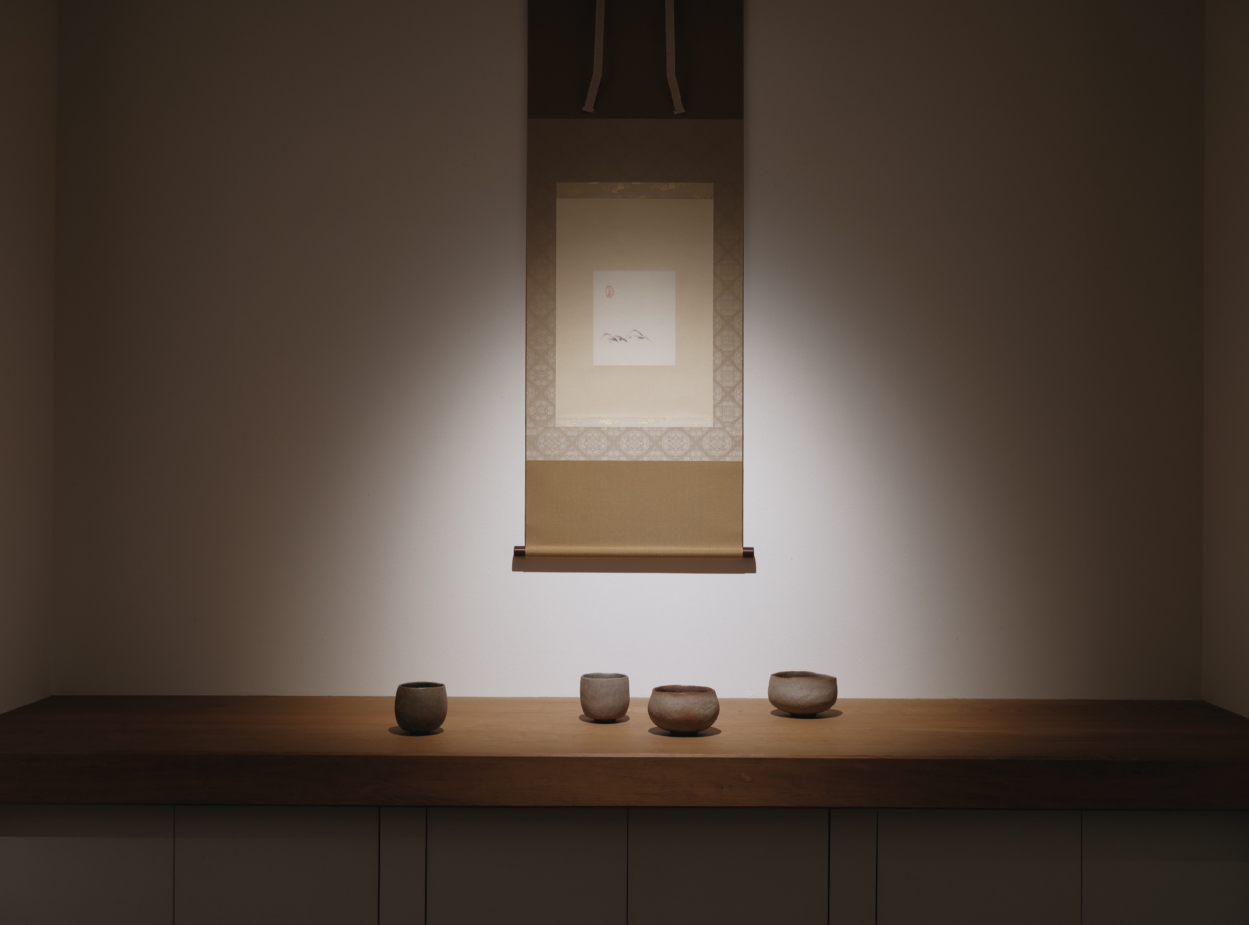 茶盌を床の間に据えてしばらく対峙していますと、ふと十年以上前に先生が「カタチすら無くしたい」と言われたことが思い出されます。時を経るごとに“土”への想いを深くされ、信仰・生活・芸術の三位一体の均衡はますます核心的となると同時に、自己は不可視で幽かな触覚として土へと抱合されつつあるように感じられます。お土の心より生った器は、私たち土の民族のよすがに他なりません。